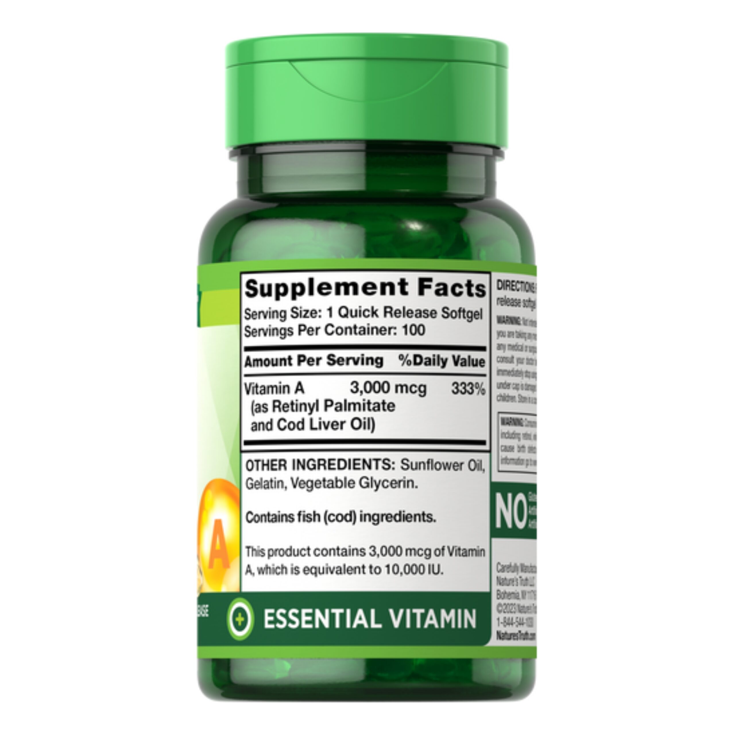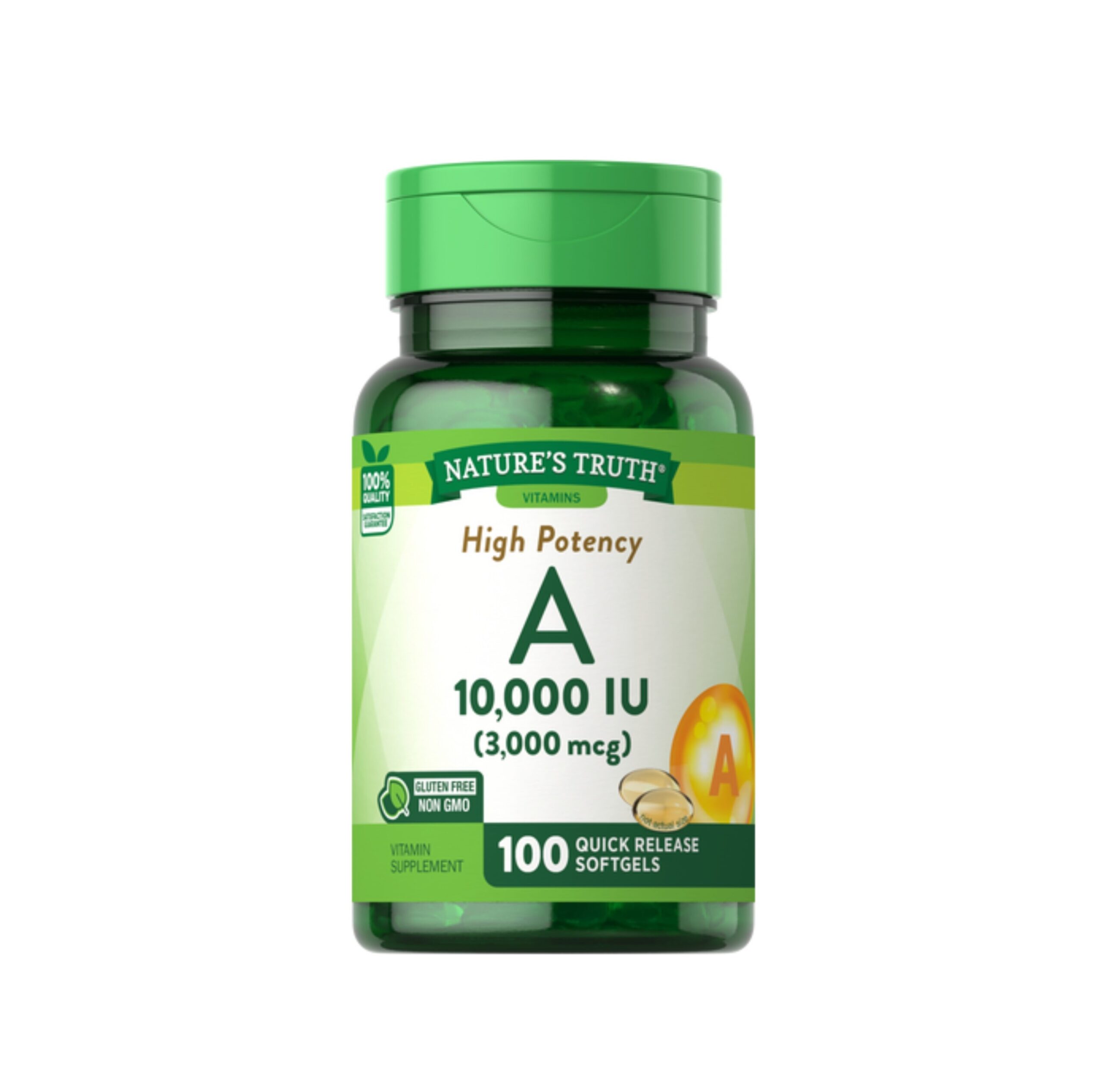 مکمل نیچرز تروث دارای دوز 3000 میکروگرمی با 100 عدد کپسول سافت ژل است که می‌توانید روزانه از آن استفاده کنید. سافت ژل ویتامین A نیچرز تروث برای عملکرد سیستم ایمنی، رشد، تشکیل استخوان، تولید مثل، التیام زخم و .. ایده‌آل است.